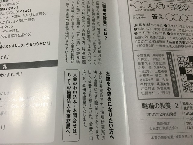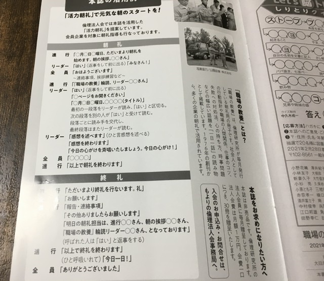 倫理法人会というこの冊子の発行元では、本誌を活用した「活力朝礼」なるものを推奨しています。